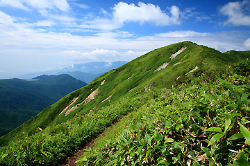 駐車場で後から来た大倉山まで登る登山者一人と会って先に出立してきたので、7時前の峠には誰も居ない。水分を補給し朝食を摂り一休み。そして周りを散策しながら花を撮影して廻る。天気は晴れだが、遠くの山々は霞んでいる。三本槍岳への尾根を少し登って振り返ると、これから行こうとする反対側の斜面にはニッコウキスゲが一面に咲くお花畑が見える。
