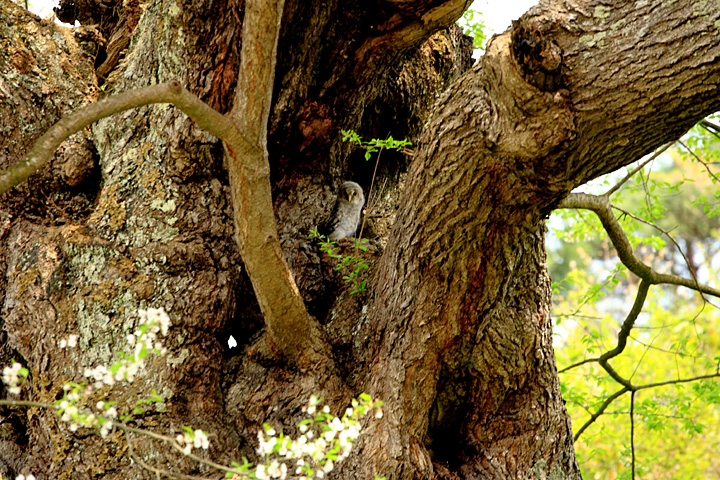 ある桜の古木を訪ねると先客の方がそっと耳打ちしてくれました。良く見るとフクロウさんが。カワイイー!まだ幼いようです。近づいても逃げません。親鳥がどこかで心配そうに見てることでしょう。そっとしておいてあげましょう。