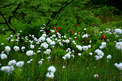 空は快晴、初夏の朝日が燦燦と降り注いでいるはずですが、山の湿原は濃い霧に包まれて薄暗く、湿原を取り囲む木々がボンヤリとシルエットを作っていました。そんな中で、ワタスゲの白いボンボンが湿原に広がり、レンゲツツジの強烈な赤が際立っていました。