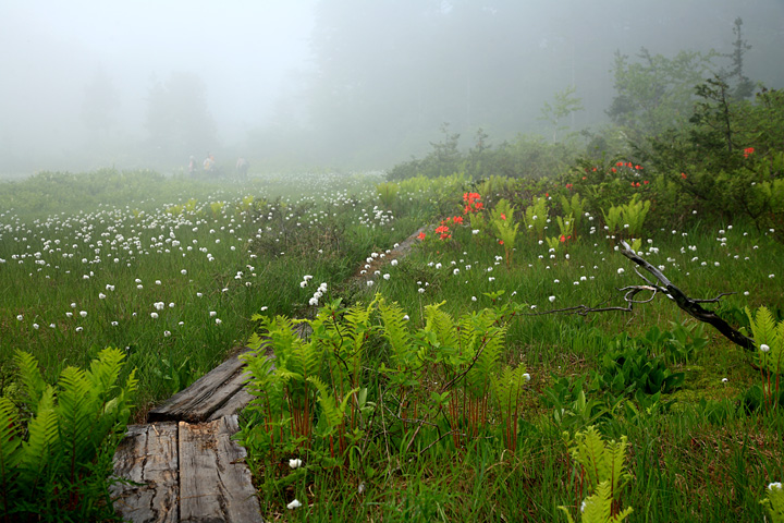 空は快晴、初夏の朝日が燦燦と降り注いでいるはずですが、山の湿原は濃い霧に包まれて薄暗く、湿原を取り囲む木々がボンヤリとシルエットを作っていました。そんな中で、ワタスゲの白いボンボンが湿原に広がり、レンゲツツジの強烈な赤が際立っていました。
